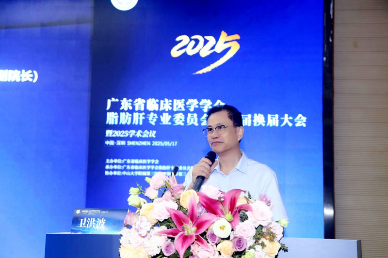 会议伊始由广东省临床医学学会副会长卫洪波教授致辞。卫洪波教授表示脂肪肝专业委员会自成立以来,在主任委员钟碧慧教授的带领下,在脂肪肝多学科诊治临床推广和诊断策略优化方面取得积极成效。对此卫洪波教授对钟碧慧教授及专委会全体成员的辛勤付出表示感谢,希望新一届委员会能够守正创新,不负使命,借助学会平台成为推动脂肪肝学科发展的重要力量,为提升医疗服务质量、保障人民健康作出更大的贡献。