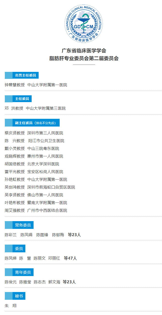 专委会进行了第二届脂肪肝专业委员会选举仪式。中山大学附属第三医院邓洪教授当选为脂肪肝专业委员会第二届主任委员。深圳市第三人民医院蔡庆贤教授、阳江市公共卫生医院陈兴教授、中山大学附属第三医院粤东医院戴小灵教授、惠州市第一人民医院观晓辉教授、北京大学深圳医院胡国信教授、深圳市宝安区松岗人民医院雷平光教授、中山大学附属第一医院孙艳虹教授、深圳市前海蛇口自贸区医院吴创鸿教授、佛山市第一人民医院吴李贤教授、暨南大学附属第一医院叶艳彬教授、广州市中西医结合医院周艾强教授当选副主任委员。本届专委会还选举产生常务委员23人,委员47人,青年委员23人。同时荣幸邀请钟碧慧教授担任专委会第二届名誉主任委员。