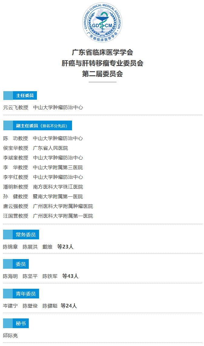 换届大会于10月12日上午8:30开始,由中山大学附属肿瘤医院肝脏外科李斌奎教授主持。首先由广东省临床医学学会会长汪谦教授为大会开幕式致辞,代表学会对换届大会的召开表示祝贺,并对第一届专委会五年来的工作表示了感谢。随后由第一届肝癌与肝转移瘤专委会主任委员元云飞教授对第一届专委会开展的工作进行总结,汇报了五年来专委会开展的工作和取得的成效,尤其是肝癌的“双转化(从转化研究到转化治疗 from translation research to conversion therapy)”理念的推进方面取得的进展,接着由广东省临床医学学会吴曼霞常务副秘书长宣读批复,接下来经选举投票产生第二届肝癌与肝转移瘤专委会的主任委员元云飞教授,副主任委员李宇红教授、唐云强教授、侯宝华教授、陈功教授、潘明新教授、李华教授、汪国营教授、孙健教授,同时产生常务委员和委员、青年委员等共计91人。新任主任委员元云飞教授表示,第二届肝癌与肝转移瘤专委会未来主要在整合省内肝癌与肝转移瘤领域专家资源,搭建高水平学术平台,提升相关人员综合诊治水平,包括免疫治疗与围手术期的安全性,加强肝癌与肝转移瘤防治科普宣讲,完善组织机制,制定新一届专委会任期目标,推进基础研究、临床研究及多学科协作,承接省内、全国肝癌与肝转移瘤诊疗领域的多中心、前瞻性临床研究等六个方面重点发力,推动肝癌与肝转移瘤诊疗水平提升。