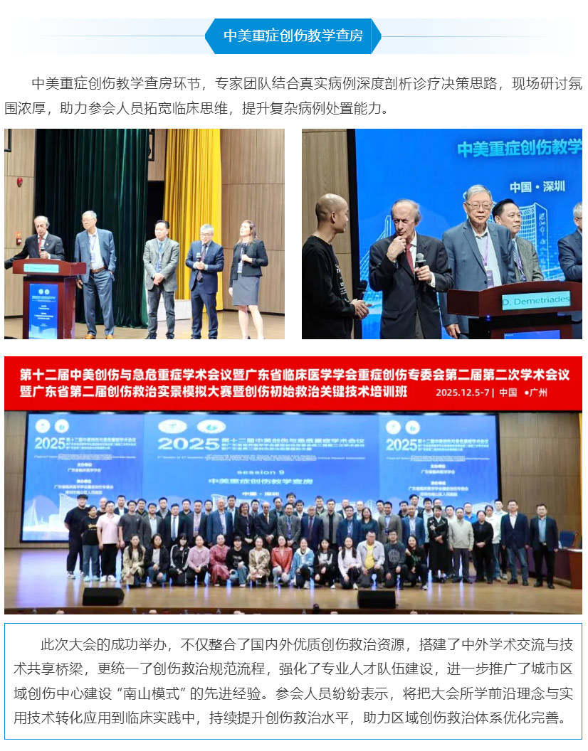 2025年12月5日-7日,由广东省临床医学学会主办、广东省临床医学学会重症创伤专委会和深圳市南山区人民医院承办的为期3天的第十二届中美创伤与急危重症学术会议暨广东省临床医学学会重症创伤专委会第二届第二次学术会议暨广东省第二届创伤救治实景模拟大赛暨创伤初始救治关键技术培训班在深圳市南山区人民医院科教行政楼举行。