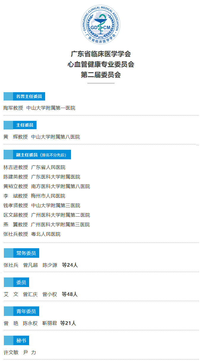 随后由陈副会长宣读了广东省临床医学学会关于同意心血管健康专委会换届的批复并按规定程序进行选举。本次会议共选举产生主任委员1名,副主任委员8名,常务委员24名,委员48名,青年委员21名,聘请名誉主任委员1名。中山大学附属第八医黄辉教授连任心血管健康专委会主任委员。
